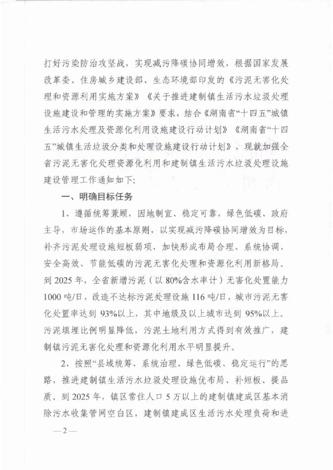 湖南发布关于加强全省污泥无害化处理资源化利用和建制镇生活污水垃圾处理设施建设管理工作的通知